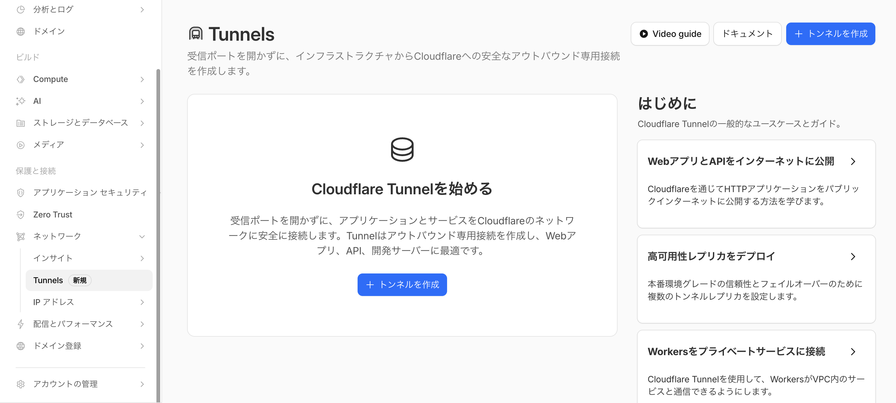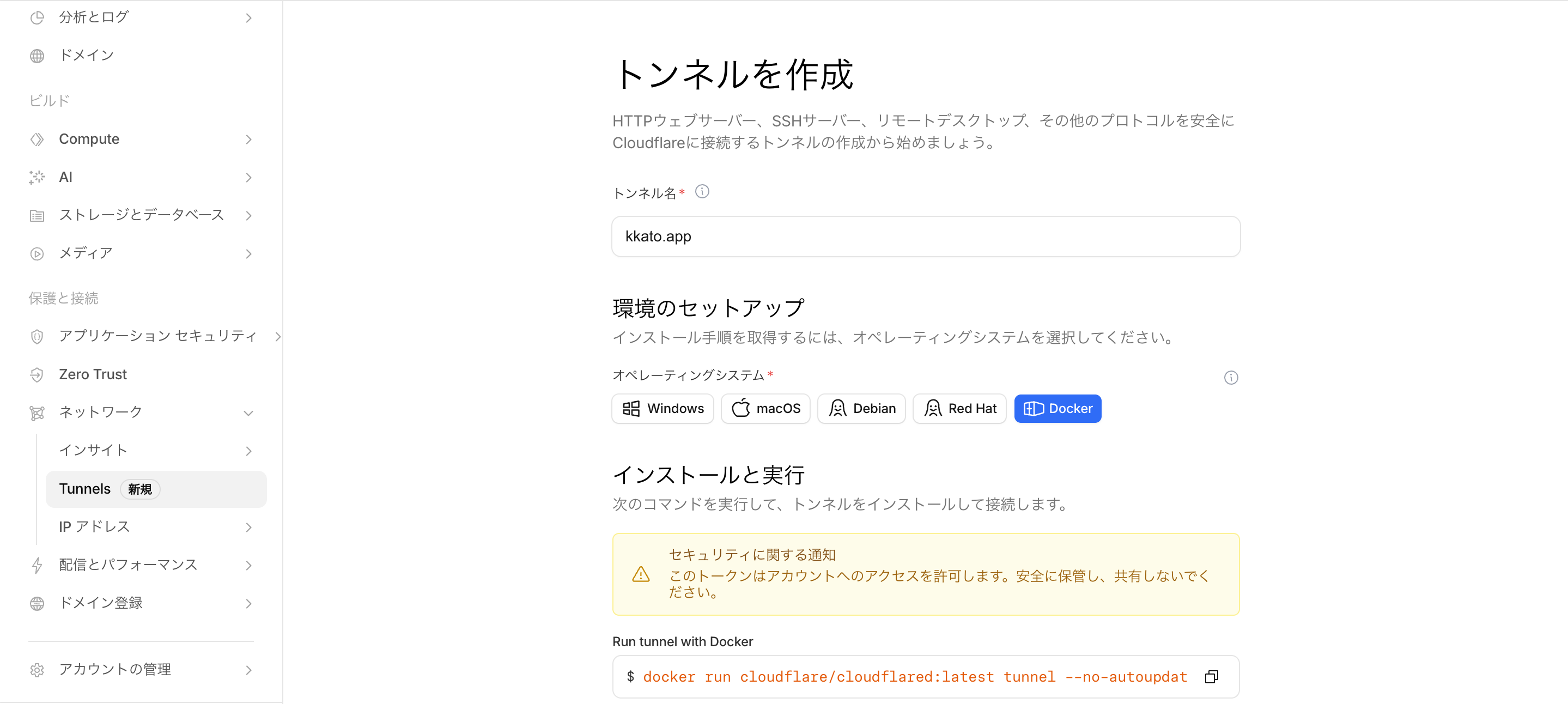 Cloudflareダッシュボードからトンネルを作成します。