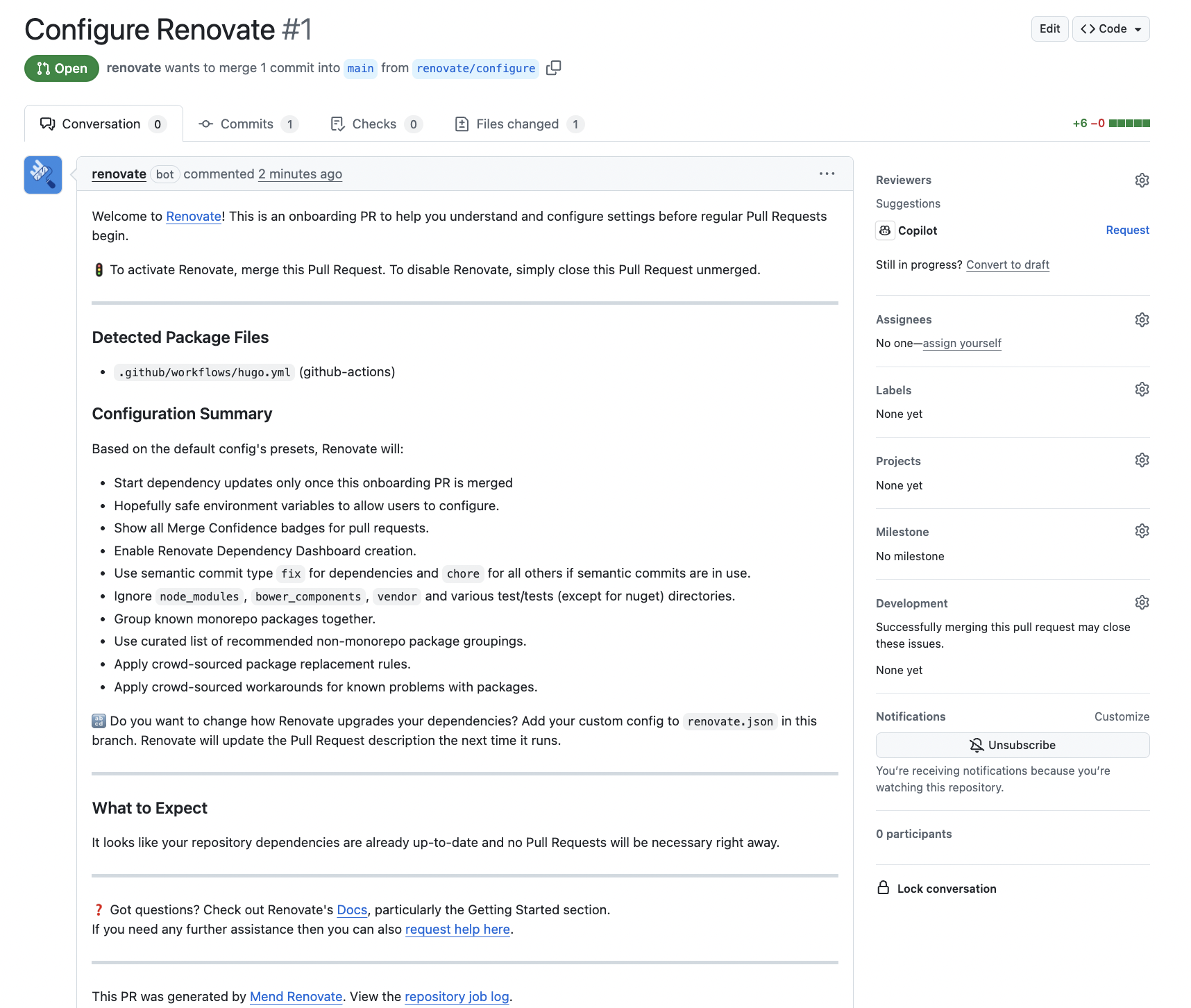 現在業務でRenovate を使ってみて感じたのは、カスタマイズ性が非常に高い反面、設定項目が多くてややとっつきにくいという点でした。しかし、プライベートの時間を使って軽く触ってみたところ、導入自体は想像以上に簡単で、いい意味で期待を裏切られました。最小限の設定でもすぐに使い始めることができましたが、もう少しドキュメントを読んで複雑な設定も試してみたいと思いました。
